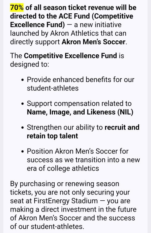 Interesting note from coach Nanchoff earlier, but don't feel it needs a new thread. It appears 70% of soccer season ticket revenue will be used for their ACE Fund. That should help boost recruiting. - Today
