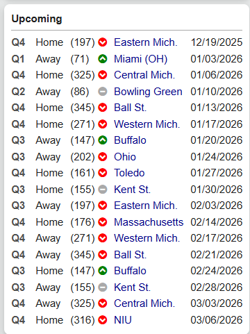Miami OH's schedule thus far (Where, Opponent, NET, Score, Result)... Q1 Games None Q2 Games None Q3 Games @ - UNC Asheville (229 NET): 90-87 OT W @ Wright State (146 NET): 83-76 W(Wright State shot 14% from 3P vs. Miami OH's 53%) Q4 Games Home - Old Dominion (245 NET): 87-72 W @ - Air Force (303 NET): 76-61 W Home - Mercyhurst (318 NET): 76-71 W Home - Ark. Pine Bluff (296 NET): 111-84 W Neutral - UNC Greensboro (295 NET): 82-71 W Home - Maine (330 NET): 93-61 W @ - Eastern Kentucky (289 NET): 79-69 Akron's Schedule... Q1 Games @ - Purdue (9 NET): 79-97 L Neutral - Yale (45 NET): 94-97 L Q2 Games Neutral - Murray St. (80 NET): 100-115 L Q3 Games Neutral - Iona (160 NET): 96-75 W Q4 Games Home - James Madison (200 NET): 85-71 W Home - Princeton (298 NET): 104-69 W Netural - Evansville (282 NET): 97-59 W Home - Milwaukee (248 NET): 105-81 W Home - Bucknell (311 NET): 97-77 W @ - Tulane (260 NET): 88-71 W Miami OH Opponent Average NET: 272.33 Miami OH Average Margin of Victory: 13.89 Akron Opponent Average NET: 189.3 Akron Victory Average NET: 251.29 Akron Average Margin of Victory: 24.14 Conclusion: Akron has played vastly better opponents, their average victory is against tougher opponents, and their margin of victory is substantially larger. Miami OH scheduling ragging will continue.